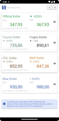 यह ऐप आपको अर्जेंटीना के आधिकारिक डॉलर और ब्लू डॉलर (समानांतर) की वर्तमान कीमतें तुरंत जानने में मदद करता है। नवीनतम विनिमय दरों से अवगत रहें और महत्वपूर्ण आर्थिक जानकारी अपनी उंगलियों पर पाएं। अर्जेंटीना की मुद्रा बाजार की सटीक जानकारी के लिए यह एक उपयोगी साधन है।