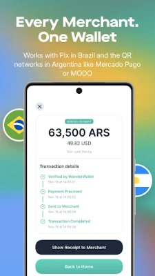 WanderWallet के साथ भुगतान करना अविश्वसनीय रूप से सीधा है। बस अपने USD या EUR को बैंक हस्तांतरण के माध्यम से अपने खाते में जोड़ें। फिर, जब भी आप अर्जेंटीना में MercadoPago या MODO जैसे क्यूआर कोड देखें, या ब्राजील में Pix के माध्यम से भुगतान करना चाहें, तो उसे स्कैन करें। आपको भुगतान करने से पहले स्थानीय मुद्रा और आपकी मूल मुद्रा दोनों में सटीक राशि दिखाई देगी, जिससे पूरी पारदर्शिता बनी रहेगी। स्थानीय बैंक खाते या कार्ड की कोई आवश्यकता नहीं – बस स्कैन करें, पुष्टि करें, और WanderWallet बाकी का ध्यान रखेगा, व्यापारी को तुरंत स्थानीय मुद्रा में भुगतान मिलेगा और आपको तत्काल पुष्टि मिलेगी।